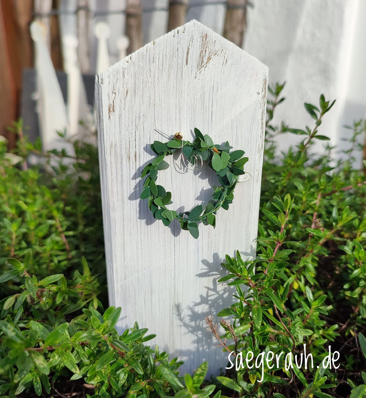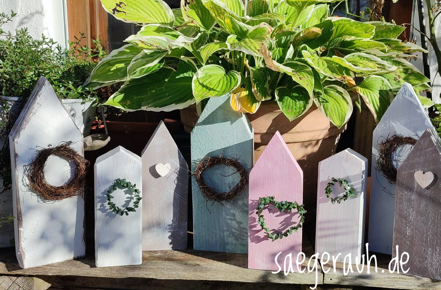 Die Häuser sind aus sägerauem Holz gefertigt, mit Kreidefarbe bemalt und mit einem Reisigkränzchen dekoriert.