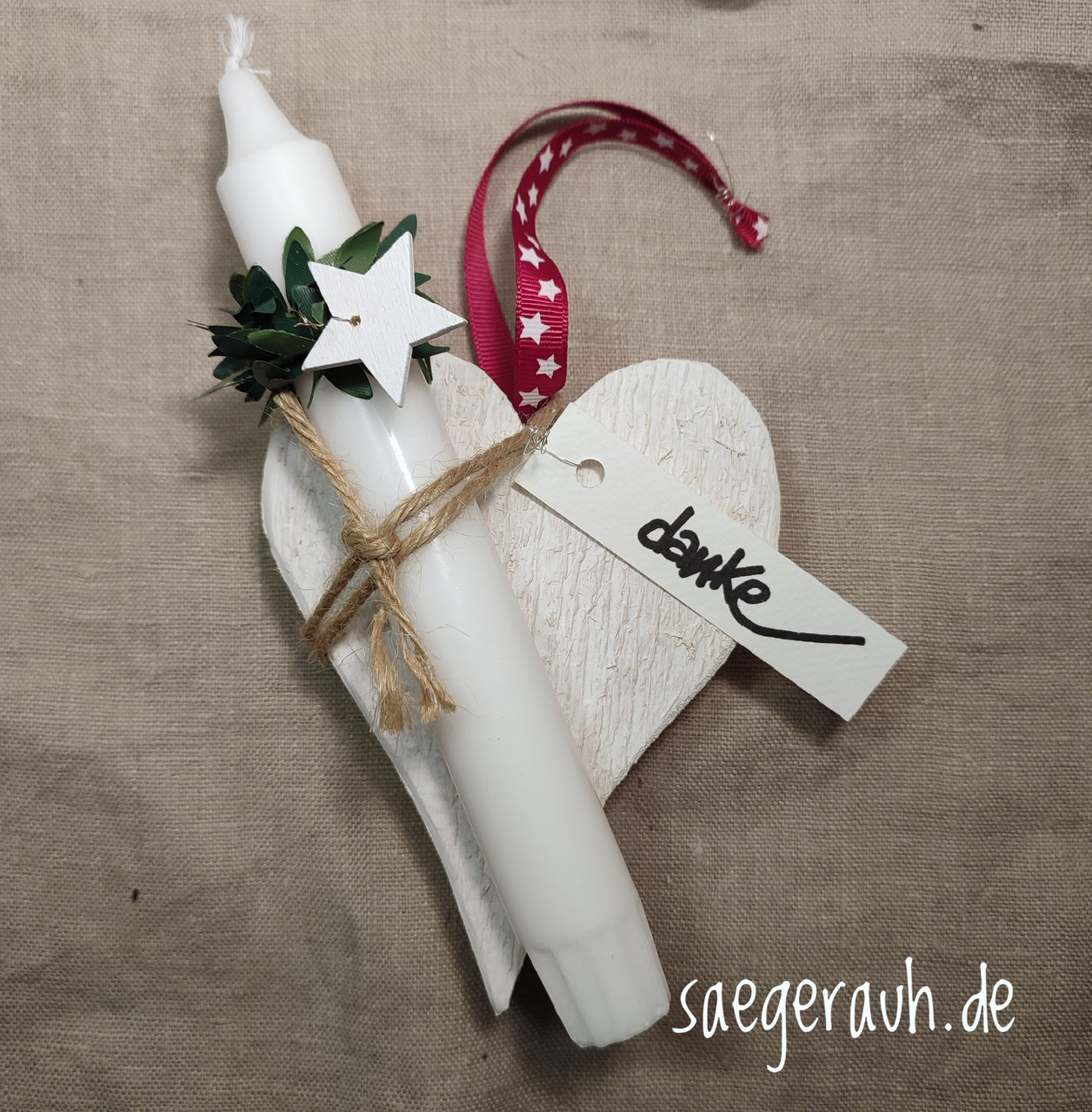 Herz aus sägerauem Holz, Maße ca. 10x12x2 cm mit weißer Kerze im Set, weihnachtlich dekoriert